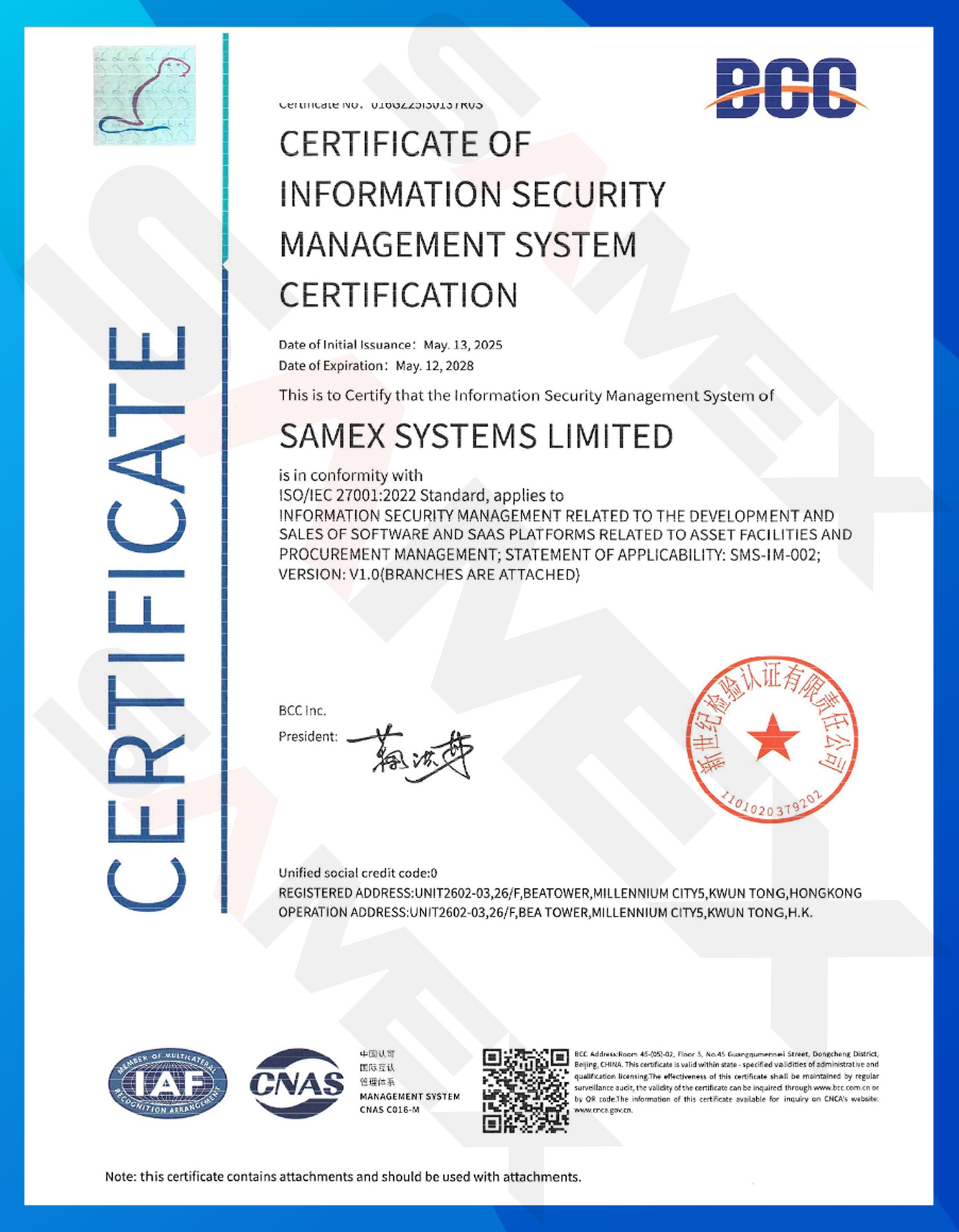 本證書標誌著 SAMEX 已建立符合國際標準的資訊安全管理體系,為客戶數據安全提供全過程的持續保障。