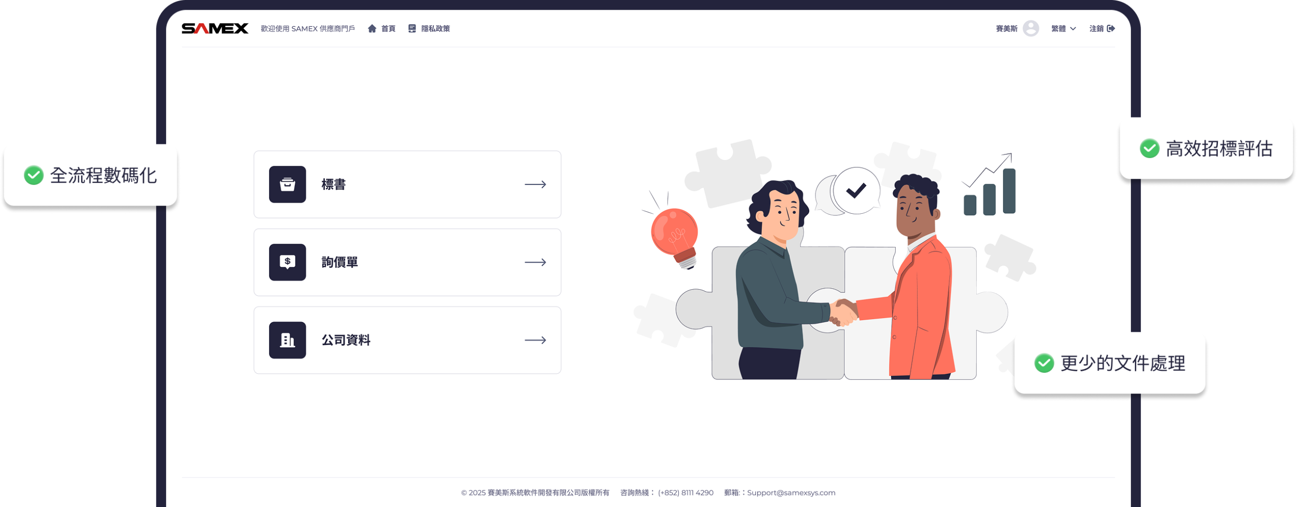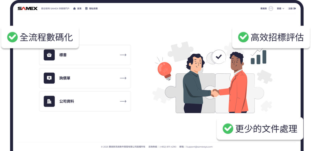 供應商門戶是SAMEX E-Tender為採購方與供應商打造的一站式在線協同平台。全流程數碼化管理,高效協同與風險可控,構建供需雙贏的供應鏈新生態。